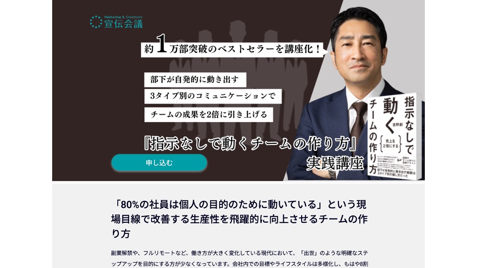 本日1/17よりリリースされる「指示なしで動くチームの作り方 実践講座」は、書籍「売り上げを2倍にする 指示なしで動くチームの作り方(ぱる出版/吉野創)」の内容をよりわかりやすく、レクチャーした動画講座です。
